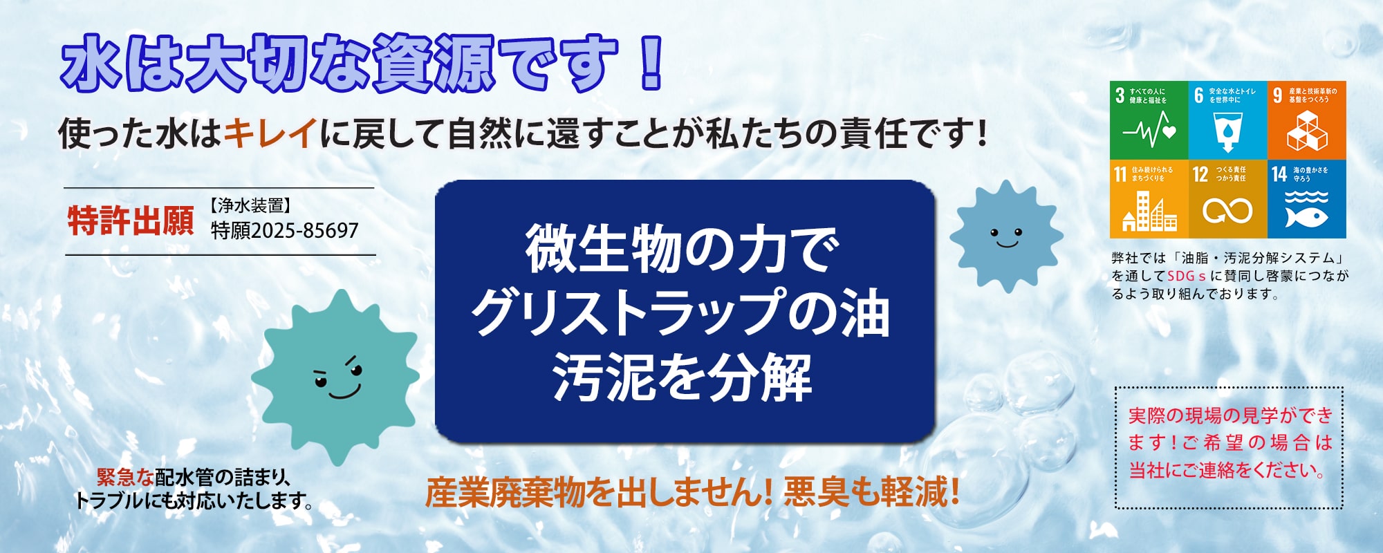 排水をキレイにすること。産業廃棄物を出さないこと。これらは国際的な開発目標であるSDGsの『水・河川・海・環境・人・地球』を守ることにつながります。当社では『油脂汚泥分解システム』を通して、SDGsへの貢献に取り組んでおります。当システムを導入されている企業様は、当社のSDGsへの取り組みを十分にご理解いただいており、共に地球の豊かさを守る意識を共有していただいている環境意識の高い企業様です。